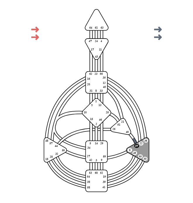 Όταν συνεργάζεται με την Πύλη 40, σχηματίζεται το Κανάλι της Κοινότητας (37-40), το αρχέτυπο της συμφωνίας και της ισότητας: δίνω-παίρνω, φροντίζω-με φροντίζουν.