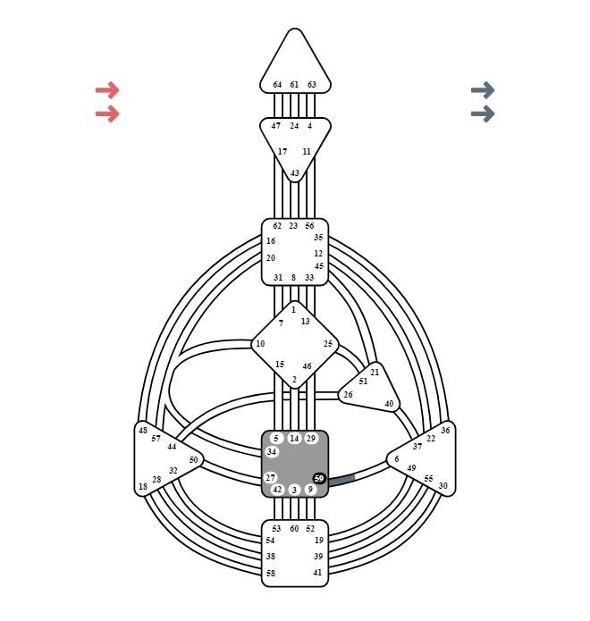 Ζει στο Κέντρο του Ιερού (Sacral) και τεντώνεται προς το Κέντρο του Συναισθήματος (Solar Plexus), συναντώντας την Πύλη 6 για να σχηματίσει το Κανάλι της Αναπαραγωγής (59-6) — τον άξονα που φέρνει σε ύπαρξη την ίδια τη ζωή.