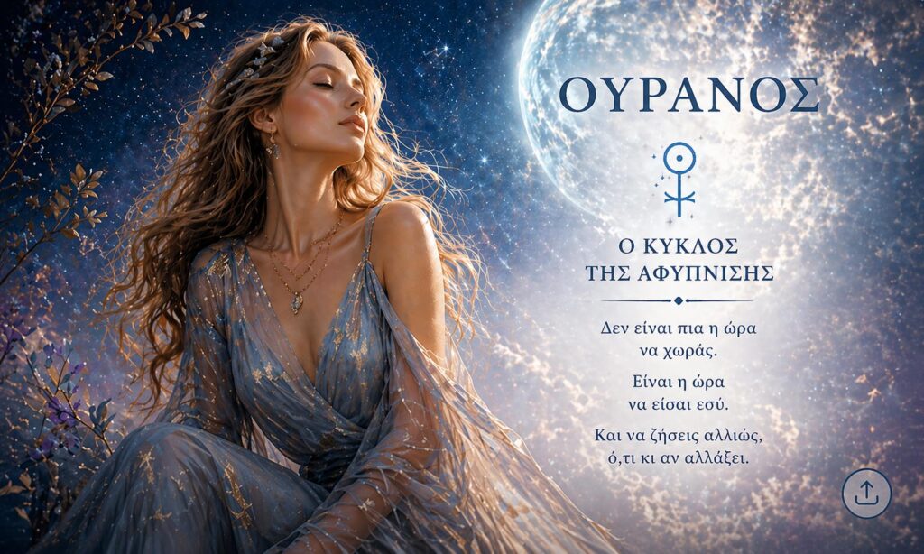 Ουρανός - ο κύκλος της αφύπνισης Δεν μπορείς να συνεχίσεις όπως πριν. Και κάπου μέσα σου το ξέρεις ήδη. Αυτό που νιώθεις δεν είναι χάος. Είναι η στιγμή που σταματάς να χωράς σε κάτι που δεν είσαι.