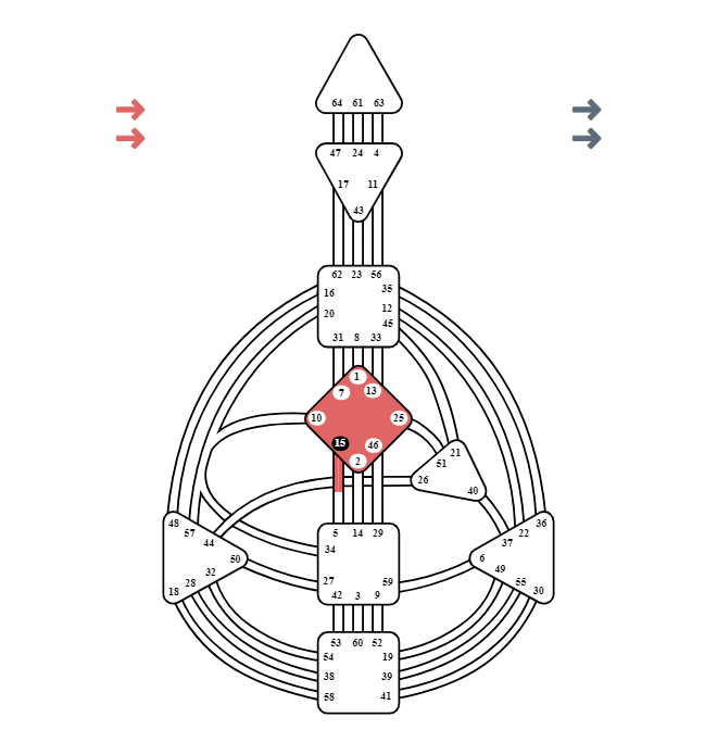 Σε σύνδεση με την Πύλη 5 σχηματίζει το Κανάλι του Ρυθμού (5-15), που φέρνει ισορροπία ανάμεσα στη σταθερότητα (5) και την ευελιξία (15).