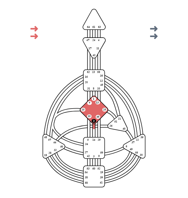 Η Πύλη 2 βρίσκεται στο G Center που είναι το κέντρο της κατεύθυνσης, της αγάπης και της ταυτότητας. Συμβολίζει την εσωτερική καθοδήγηση της Ψυχής, τη σοφία που δεν χρειάζεται λογική, μόνο αποδοχή και εμπιστοσύνη. Είναι εδώ για να λαμβάνει, να παρατηρεί και να επιτρέπει στη ζωή να ρέει μέσα της.