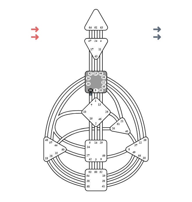 Αυτή η Πύλη απλώνει το χέρι της προς τον Λαιμό το κέντρο της έκφρασης, της φωνής και της δράσης για να συναντήσει την Πύλη 31, γνωστή και ως “Η Φωνή του Θρόνου”.