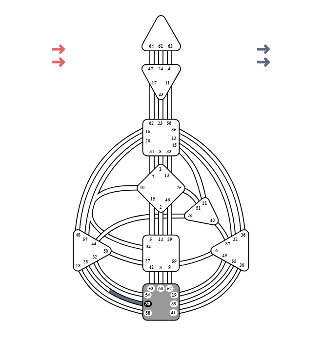 Η Πύλη 38 σχετίζεται με τη μάχη για νόημα και σκοπό στη ζωή. Όταν βρίσκεσαι στη Σκιά αυτής της πύλης, μπορεί να νιώθεις ότι είσαι παγιδευμένος σε μοτίβα ή συνήθειες που δεν σε εξυπηρετούν πια.